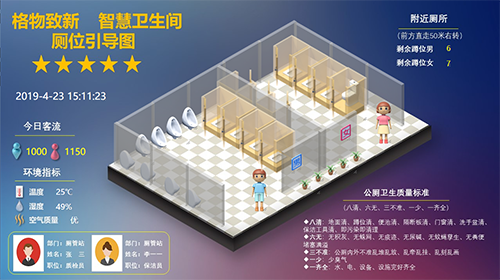 厕位引导大屏可动态显示厕位平面图、厕位占用信息、厕内环境信息、公告信息,以及其他多媒体信息等。